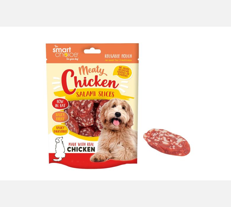 Delicious chicken flavoured salami slice treats for dogs. Perfect for a tasty snack or for rewarding good behaviour.