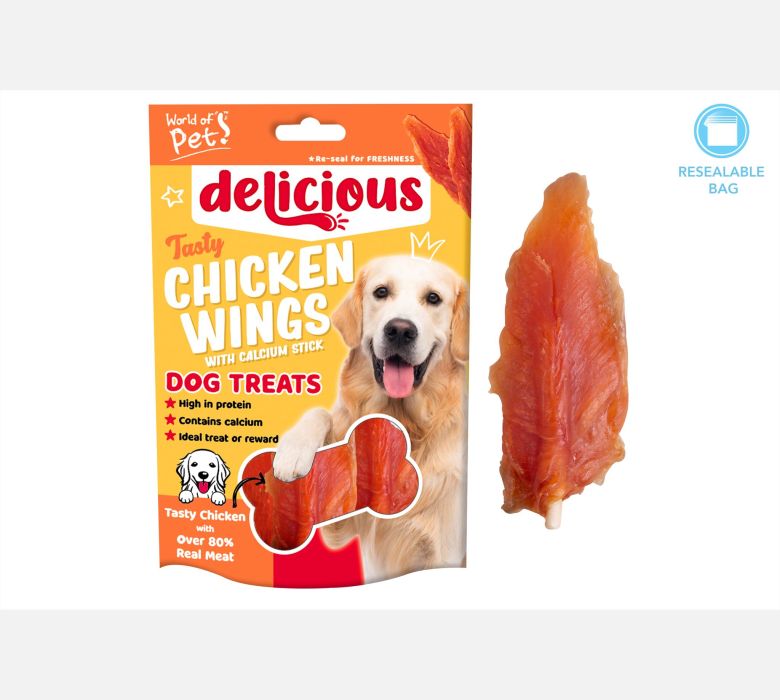 Soft chicken wings with calcium stick. Perfect for a tasty snack or for rewarding good behaviour.