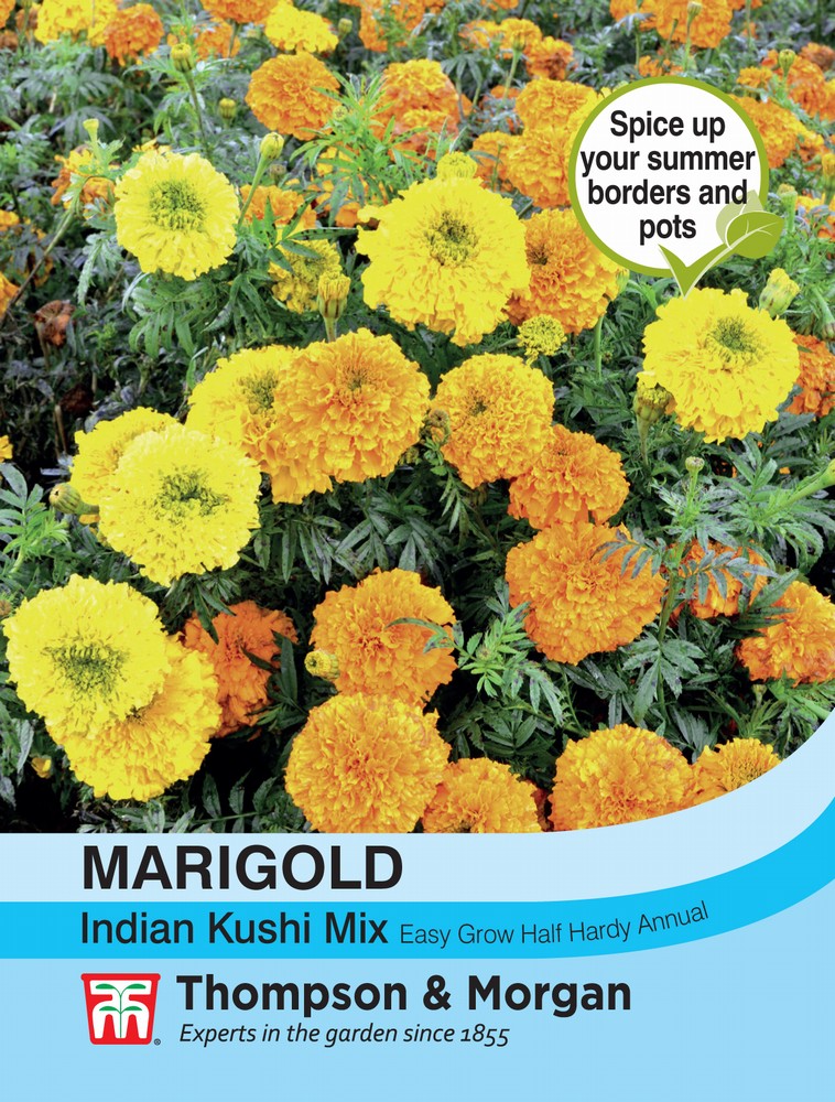 Marigold ‘Kushi’ Mix is named after the Hindi word for ‘Joy’ and is the first Indian Marigold available for purchase in the UK. This colour mix or yellow to orange blooms is inspired by the gorgeous garlands of African Marigold flower heads created for Indian weddings and special occasions. The sunshine blooms of these Targetes will brighten your summer borders and patio pots from July to September – plus their longer stems make them ideal for cut flowers. Why not create your own ‘Kushi’ Marigold flower garlands to dress your outside spaces for summer gatherings? Height 60cm (24″). Spread 40cm (16″).