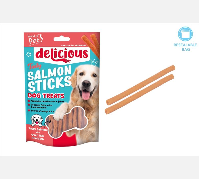 Delicious salmon sticks treats for dogs. Perfect for a tasty snack or for rewarding good behaviour. Find more great quality treats in the World of Pets range from RSW.